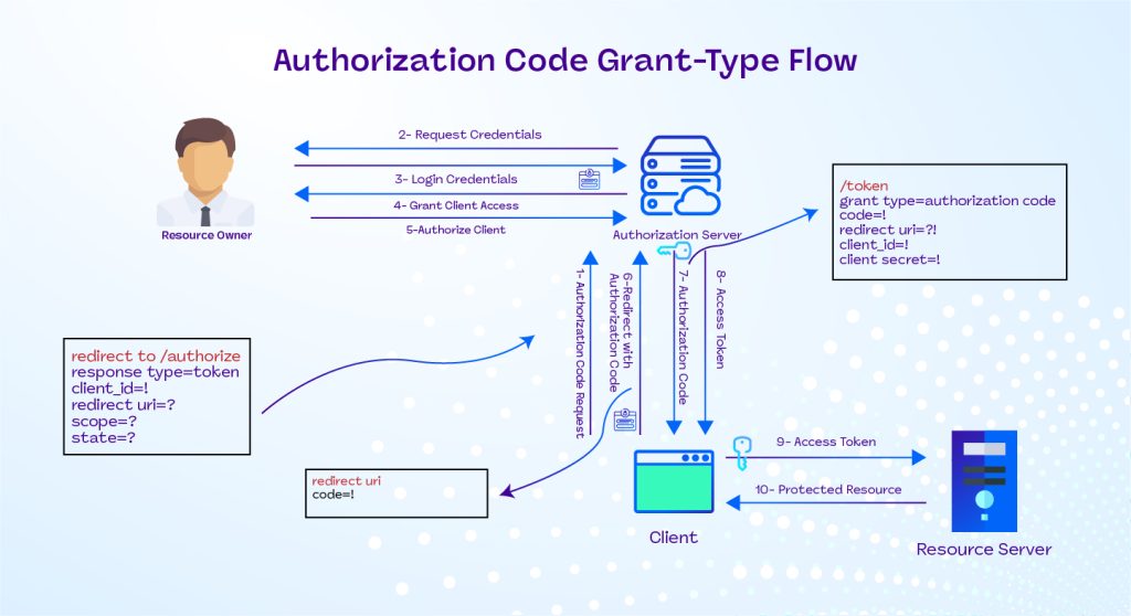 5- The authorization server redirects back to the client, which then uses the authorization code to request an access token, specifying the grant type as “code”, along with the authorization code, client ID, and client secret.